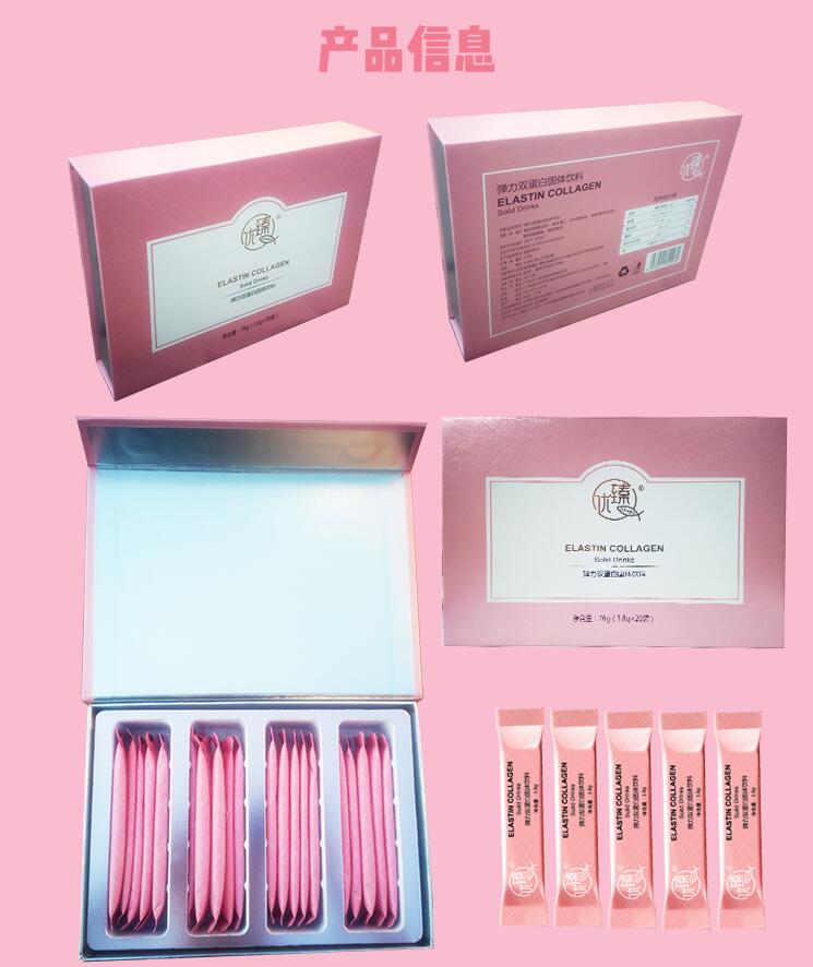 ◇ 產(chǎn)品規(guī)格:3.8g/袋*20袋/盒(每袋含有彈性蛋白40mg)